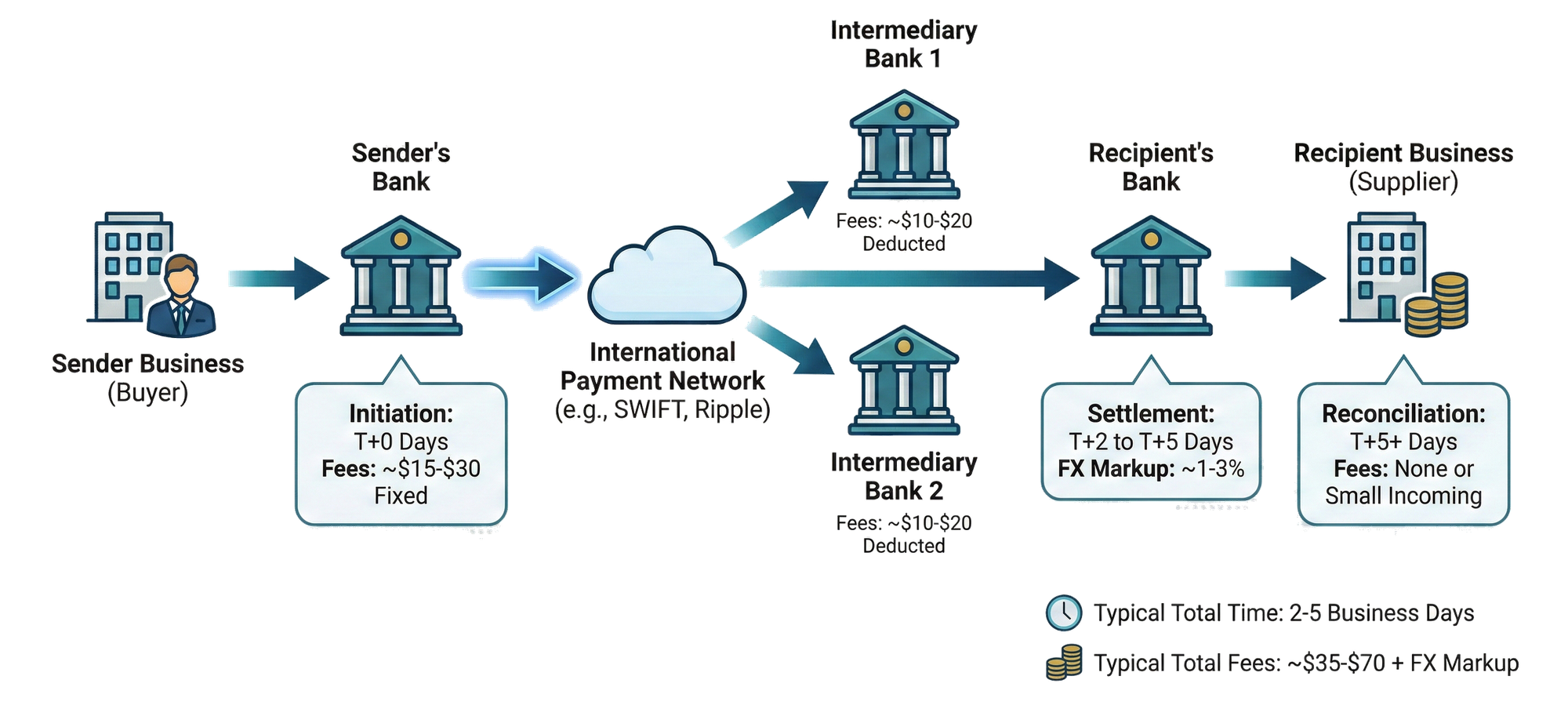 International payments are even worse. Sending money through traditional networks like SWIFT means contending with flat outbound fees of $25–50, hidden FX markups of 2–3% above mid-market rates, additional deductions from intermediary correspondent banks, and settlement times measured in days. Senders routinely face uncertain final delivery amounts, cash flow delays, and the administrative purgatory of tracing lost funds across borders.
