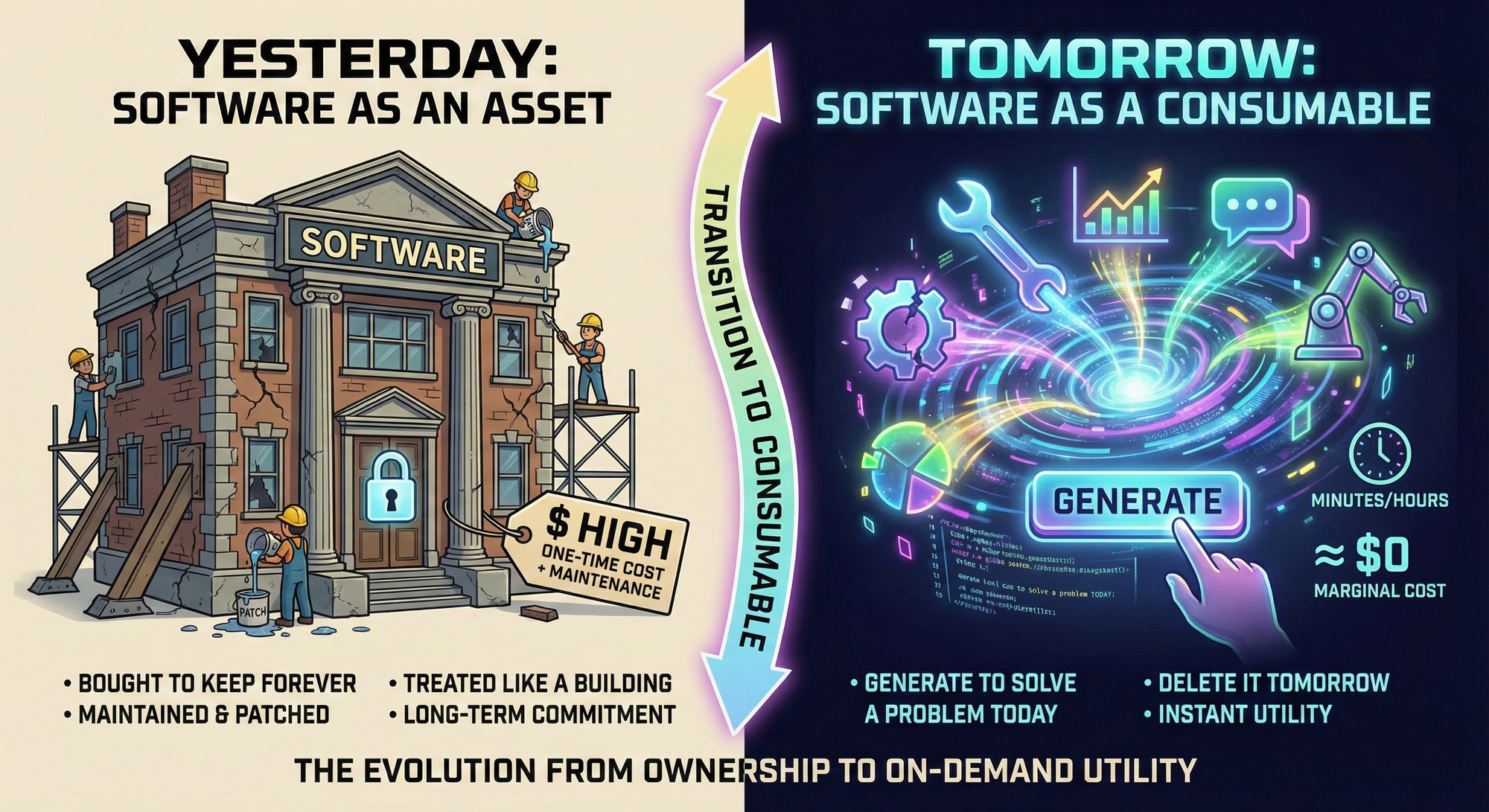 Next quarter, you generate a new one. It will be better, because the underlying AI model will have improved. In this world, technical debt is a concept that applies only to legacy infrastructure. For the user, the application is just a temporary bridge to an outcome.