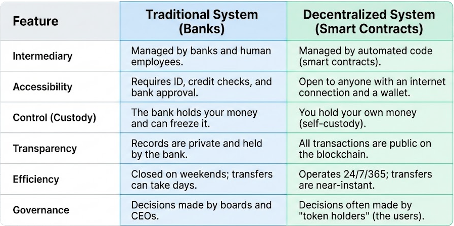 Unlike traditional finance, which relies on centralized institutions (banks, brokerages, or clearinghouses), DeFi uses smart contracts—self-executing code—to handle transactions directly between participants. These smart contracts can exist in perpetuity and manage pension distributions or collect loan repayments. Contracts are like programs that live on the blockchain. They can be turned on to perform computation, provided they pay gas fees to the blockchain for the compute.